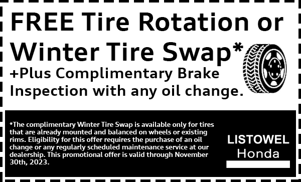 As a token of our appreciation for choosing Listowel Honda, we are excited to announce a special promotion. For a limited time, when you come in for an oil change, we will provide a FREE Tire Rotation or Winter Tire Swap (tires on rims). Plus, to ensure your vehicle's optimal performance and safety, this offer also includes a Complimentary Brake Inspection.